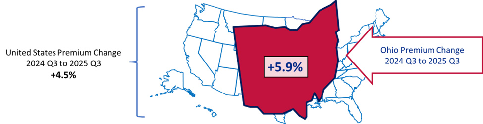 At a national level, premium growth continues to slow. After exceeding 10 percent in 2023, total P&C premium growth moderated to 4.5 percent by Q3 2025. Ohio remains slightly ahead of that pace, with premium growth of 5.9 percent over the same period. Homeowners and Other Liability (Occurrence) continue to be among the fastest‑growing lines nationwide.